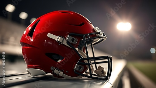 Fototapeta premium American football helmet resting on bench with dramatic stadium lighting in...