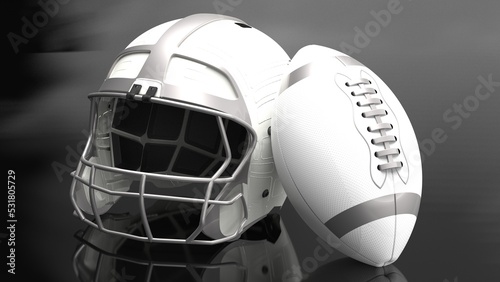Naklejka premium American football White-Silver helmet and white-Silver Ball under foggy black laser lighting. 3D illustration. 3D CG. 3D high quality rendering.