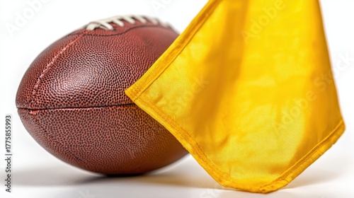 © Generative AI, Naklejka premium American Football with Penalty Flag Still Life Isolated on White Background for Sports Concepts