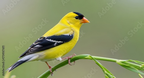 © Moslema, Naklejka premium American Goldfinch perched on a green branch showing black and white wing feathers
