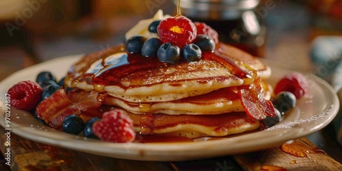 Fototapeta premium American Pancake Platter with Crispy Bacon Fresh Berries Maple Syrup and...