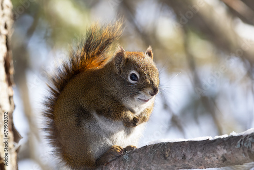 Obraz premium American red squirrel is sitting on a branch in cold day.