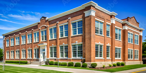 Fototapeta premium American school building with brick exterior and white windows, school,...