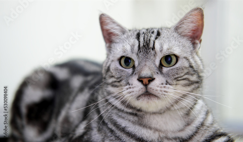 Fototapeta premium American shorthair male cat classic silver color sitting and looking with...