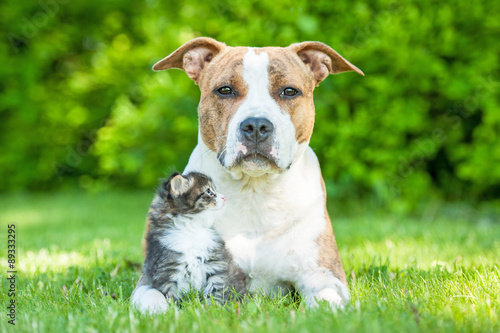 Obraz premium American staffordshire terrier dog with little kitten