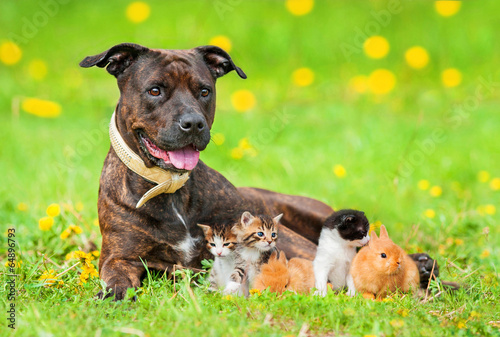 Obraz premium American staffordshire terrier with little kittens and rabbits