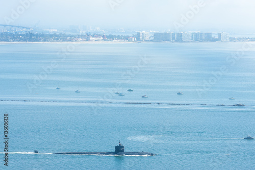 © Natalia Bratslavsky, Fototapeta premium American submarine leaving naval base in San Diego harbor, California