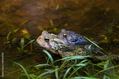 Fototapeta premium American toads (Anaxyrus americanus) mating in a shallow pool of water, Wissahickon Valley Park, Philadelphia, Pennsylvania, USA