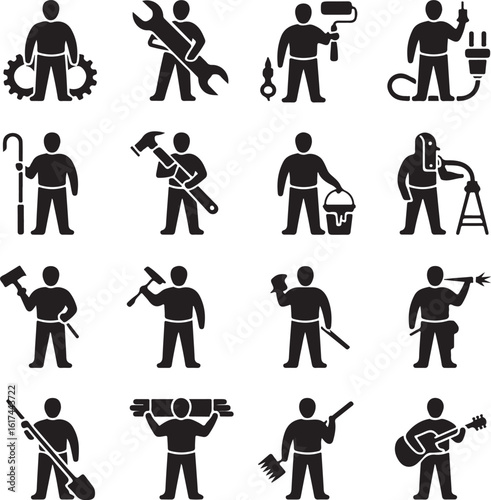 © vector design, Obraz premium American Worker Silhouette IllustrationHardworking Laborer Silhouette VectorConstruction Worker with Tools SilhouetteStrong American Worker Outline ArtIndustrial Worker Silhouette Design