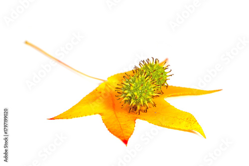 Naklejka premium Amerikanischer Amberbaum, Blatt und Frucht vor weißem Hintergrund