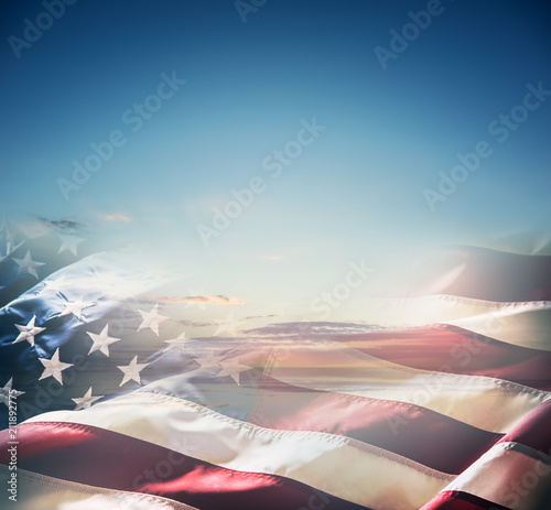 Fototapeta premium Amerykańska flaga na piękny zachód lub wschód słońca.