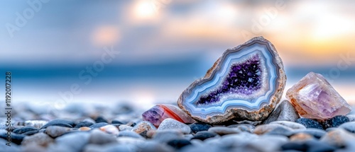 Naklejka premium Amethyst Geode Crystal Agate Rose Quartz on Beach at Sunset