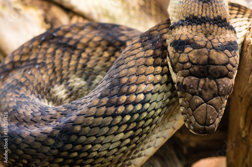 © iredding01, Naklejka premium Amethystine python (Morelia amethistina) looking down on head. Large snake in family Pythonidae, found in Indonesia, Papua New Guinea and Australia