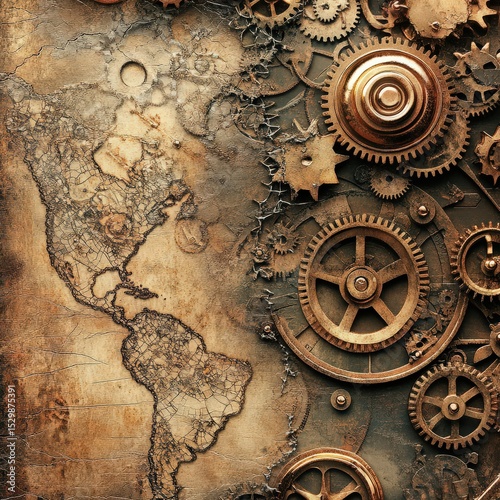 Naklejka premium Amidst a backdrop rich with aged parchment and ornate typography intricate brass and copper gears unite with whimsical steam effects creating a captivating steampunk aesthetic filled with fantasy