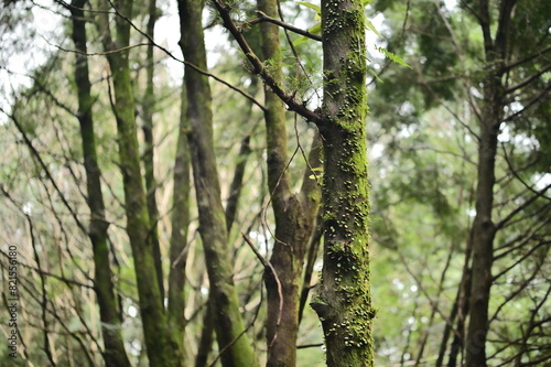 © Moment Capsule, Naklejka premium Amidst a rich natural landscape, sunlight filters through the canopy, illuminating a mossy tree trunk adorned with verdant climbers.