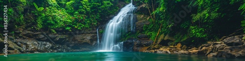 Fototapeta premium Amidst an idyllic scene, a flowing waterfall splashes through lush jungle,...