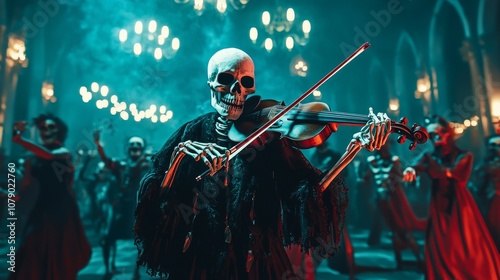 Naklejka premium Amidst swirling shadows ghost like skeleton plays haunting melody violin captivating audience dancing demons chilling Halloween gathering.