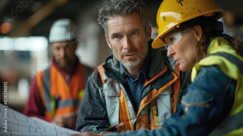 © sirisakboakaew, Obraz premium Amidst the hustle and bustle of the workspace, a male architect dons reflective attire as he carefully examines a blueprint, oblivious to the chatter of his coworkers nearby