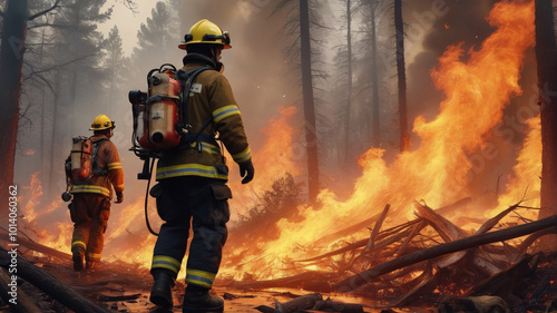 © 4K_Heaven, Fototapeta premium Amidst the raging inferno, firefighters battle the blaze, their heroic efforts aimed at quelling the flames and saving the precious woodland, Generative AI