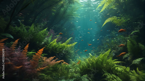 Fototapeta premium Amidst the Underwater Forest, lush ferns sway gently, their fronds providing shelter for colorful fish darting through the greenery, Generative AI