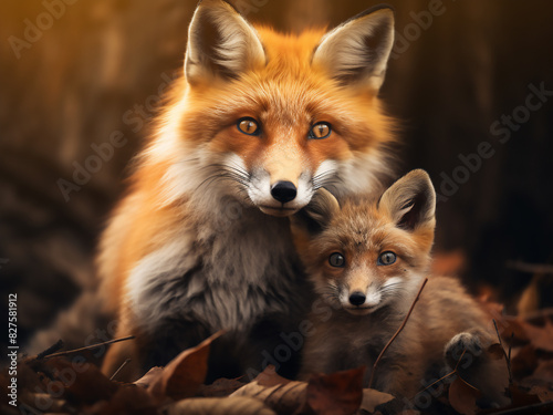 © Llama-World-studio, Obraz premium Amidst the wilderness, an adult fox of the Vulpes vulpes species is accompanied by its offspring
