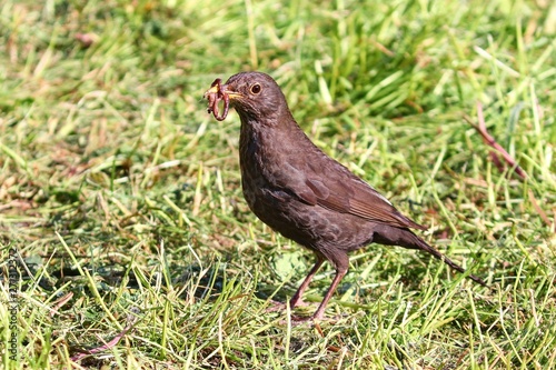 © Manfred Richter, Fototapeta premium Amsel mit Regenwum im Schnabel