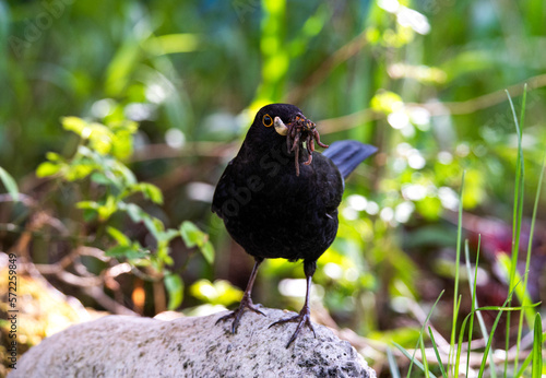Obraz premium Amselhahn mit Würmern im Schnabel auf einem Stein