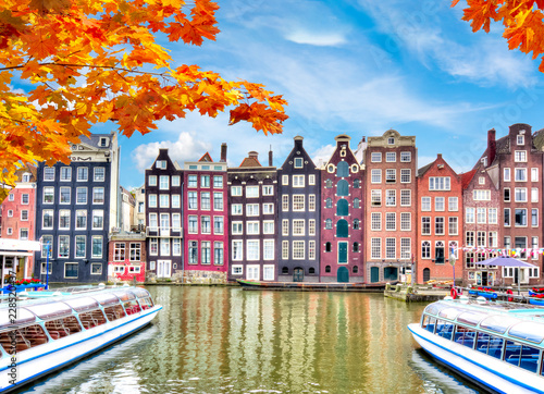 Naklejka premium Amsterdam architecture at Damrak canal in autumn, Netherlands