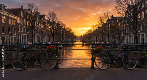 Obraz premium Amsterdam Canal Sunset View with Bicycles