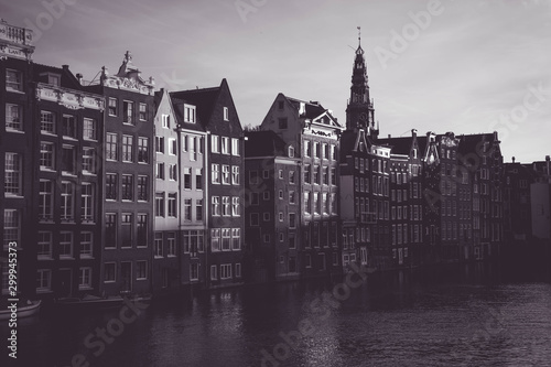 Fototapeta premium Amsterdam canal with typical dutch houses. Netherlands cityscape.