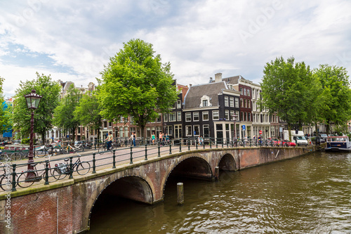 © Sergii Figurnyi, Naklejka premium Amsterdam canals and boats, Holland, Netherlands.