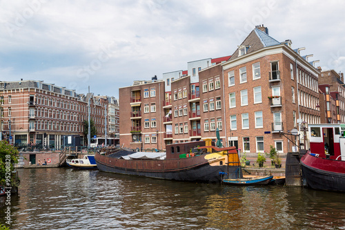 © Sergii Figurnyi, Naklejka premium Amsterdam canals and boats, Holland, Netherlands.