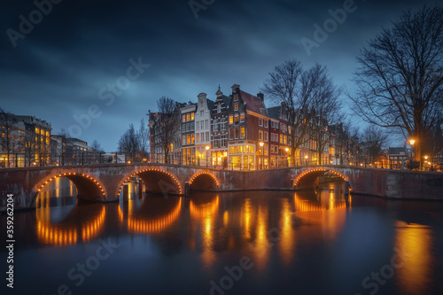 © Ivan Kurmyshov, Fototapeta premium Amsterdam city canal old town, Netherlands. Beautiful iconic view illuminated at night