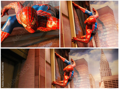 Naklejka premium Amsterdam - Netherlands - August 8, 2018: Collage of The amazing Spider-Man life size statue. Madame Tussauds museum. Amsterdam.