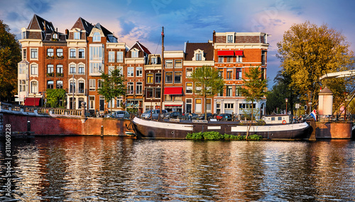 © Yasonya, Fototapeta premium Amsterdam, Netherlands. Floating House and houseboat at channels by banks. Traditional dutch dancing houses among trees. Evening autumn street above water pink sunset sky with clouds.