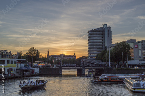 © i_valentin, Naklejka premium Amsterdam, Netherlands - July 02, 2018: View of modern buildings on Amsterdam's embankment