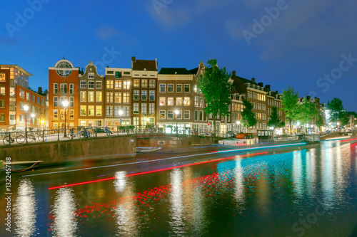 Obraz premium Amsterdam. Nocny widok domów wzdłuż kanału.