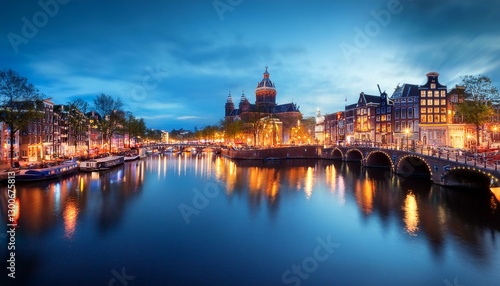 © Donald, Naklejka premium amsterdam panoramic view of the downtown of amsterdam a blue evening time and the serene reflection of lights in the water europe netherlands holland amsterdam