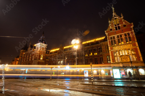 © fukez84, Obraz premium Amsterdam train station during early morning before sunrise , Amsterdam , Netherlands : November 27 , 2019