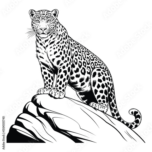 Fototapeta premium Amur Leopard on a rock Coloring Page, Silhouette, Vector, Illustration, Icon, Logo, White Background.