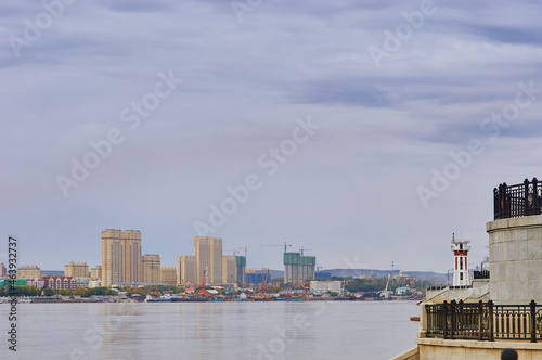 © Алексей Игнатов, Fototapeta premium Amur river. Lighthouse on the embankment of Blagoveshchensk, Russia. Heihe city, China across the river.