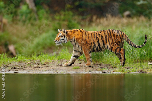 © ondrejprosicky, Naklejka premium Amur tiger walking in river water. Danger animal, tajga, Russia. Animal in green forest stream. Grey stone, river droplet. Siberian tiger splash water. Tiger wildlife scene, wild cat, nature habitat.