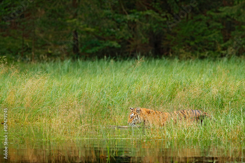 © ondrejprosicky, Fototapeta premium Amur tiger walking in river water grass. Danger animal, taiga, Russia. Animal green forest stream. Siberian tiger splash water. Tiger wildlife scene, wild cat, nature habitat. Green lake hidden tiger