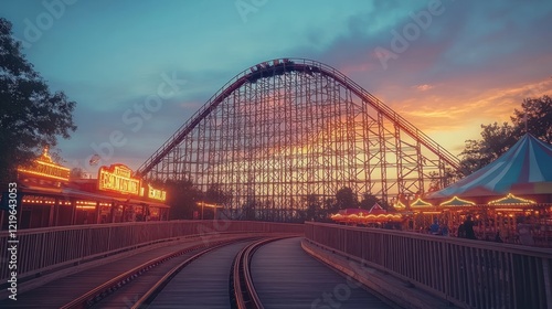 Obraz premium Amusement park roller coaster sunset scene.