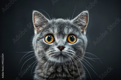 © Anzhela, Fototapeta premium Amusing British shorthair cat with a surprised expression against a dark background