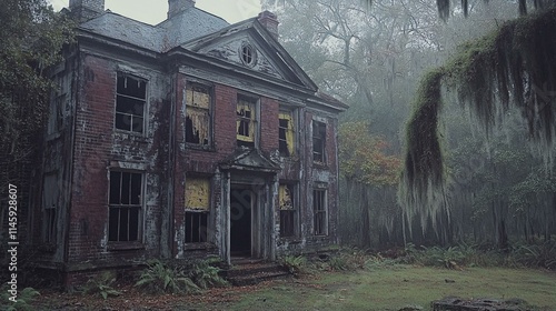Obraz premium An abandoned colonial plantation house in the southern United States, with peeling paint, shattered windows, and moss hanging from nearby trees