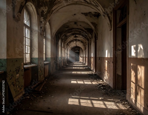 © Yoga, Fototapeta premium An abandoned, decaying, long corridor with arched ceiling