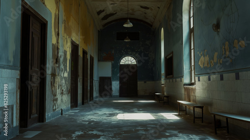 Fototapeta premium An abandoned hospital hallway, the walls painted in faded blue and cream hues with peeling paint, light filtering through broken windows, evoking a sense of eerie stillness and decay.