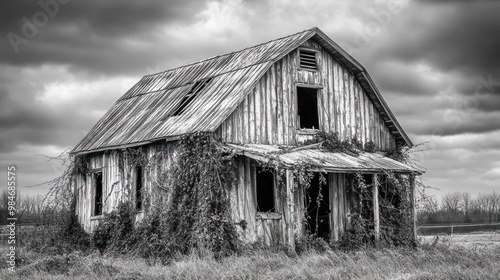 © BerkahStock, Obraz premium An abandoned, overgrown barn stands under a dramatic sky, evoking a sense of decay and nature's reclaim.