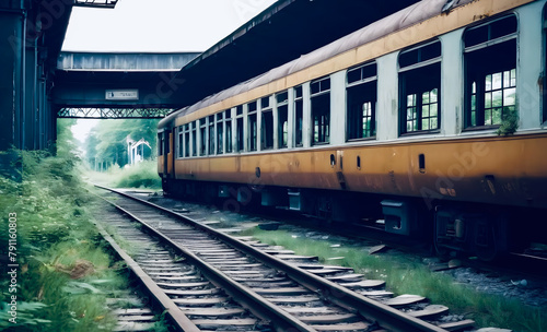 © ConceptStudio, Fototapeta premium An abandoned railway station is completely overgrown with greenery.